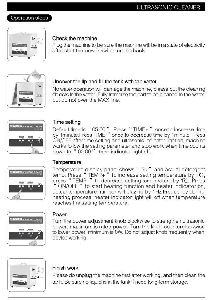 Digital Timer and Heater: Users can set precise cleaning durations from 1 to 99 minutes and adjust the temperature between 20°C and 80°C, allowing customization based on the specific requirements of each task.
